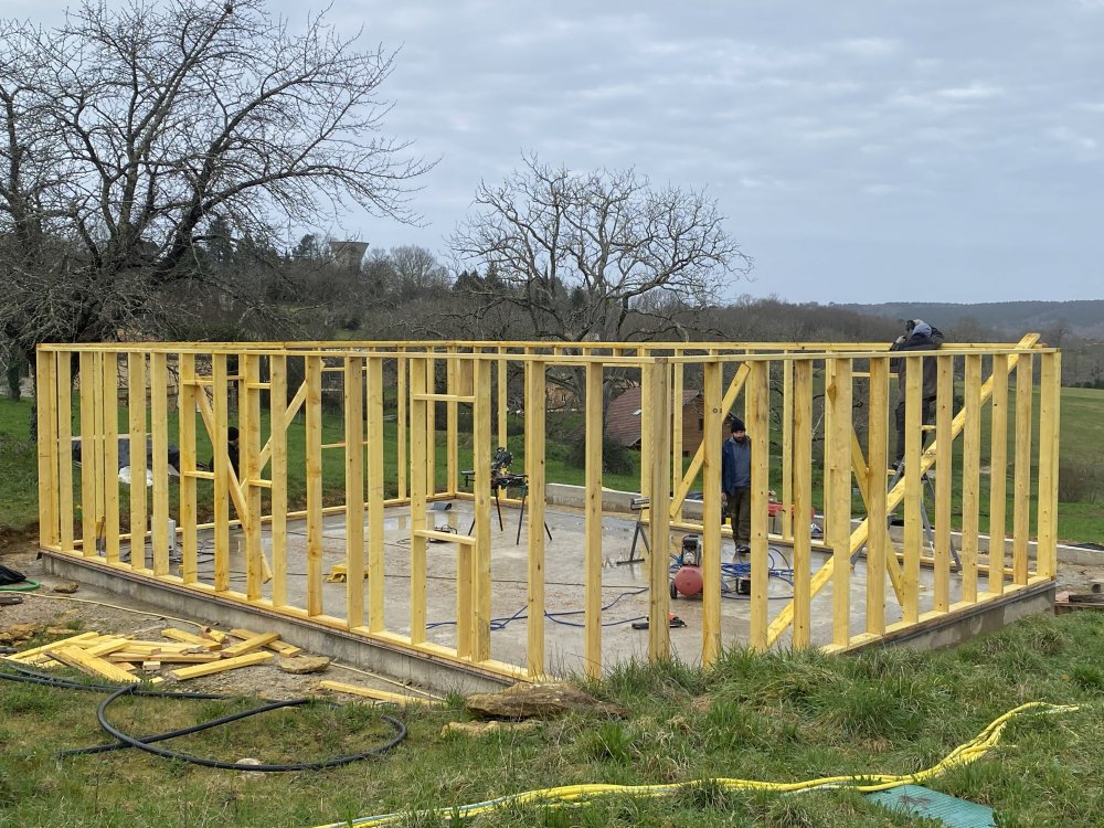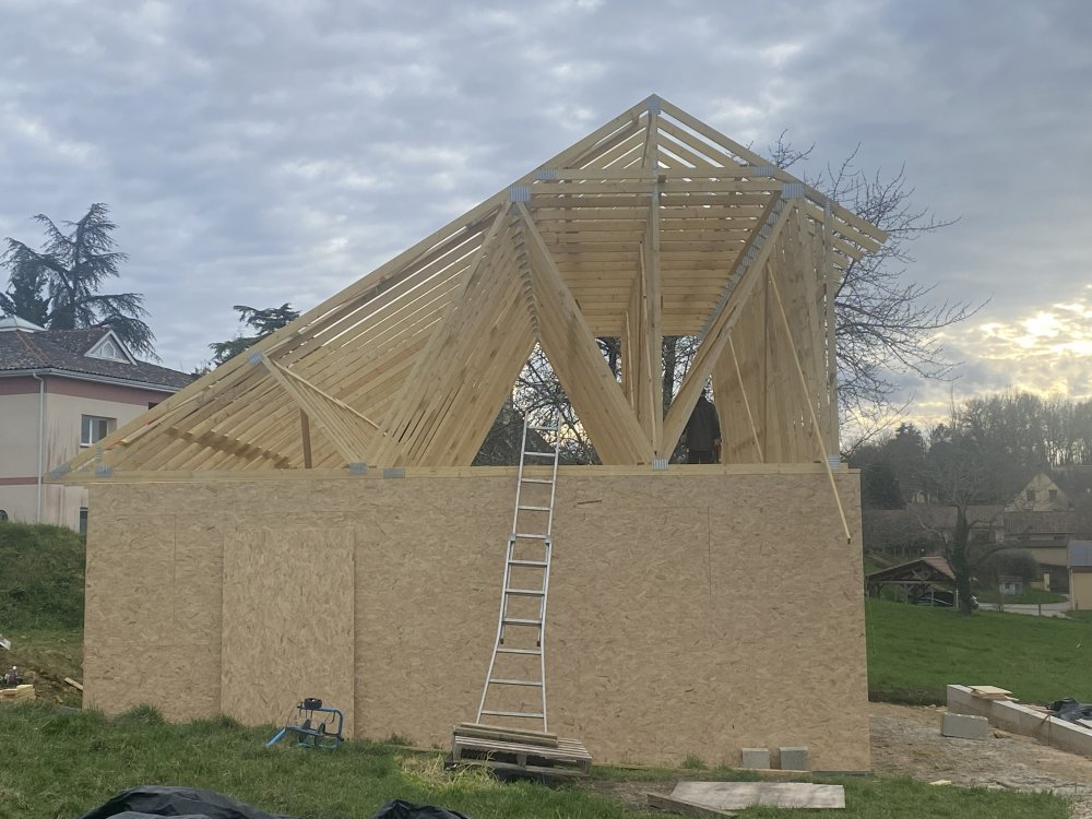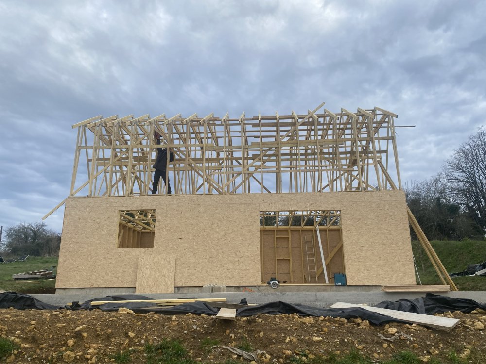 La structure ossature bois du corps de la maisona été faite par les charpentiers, celle de la toiture est constituée de fermettes fabriquées par une entreprise locale.