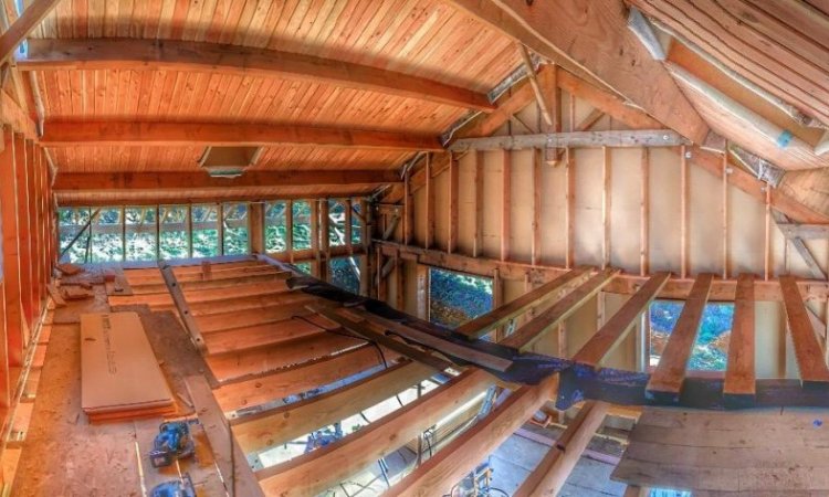À l'intérieur du chalet, le frein vapeur est désormais entièrement posé. Il a pour but de limiter la pénétration de la vapeur d'eau dans les parois du bâti. Il prévient ainsi la formation de condensation, source de moisissures dégradant les parois et la qualité de l'air intérieur.